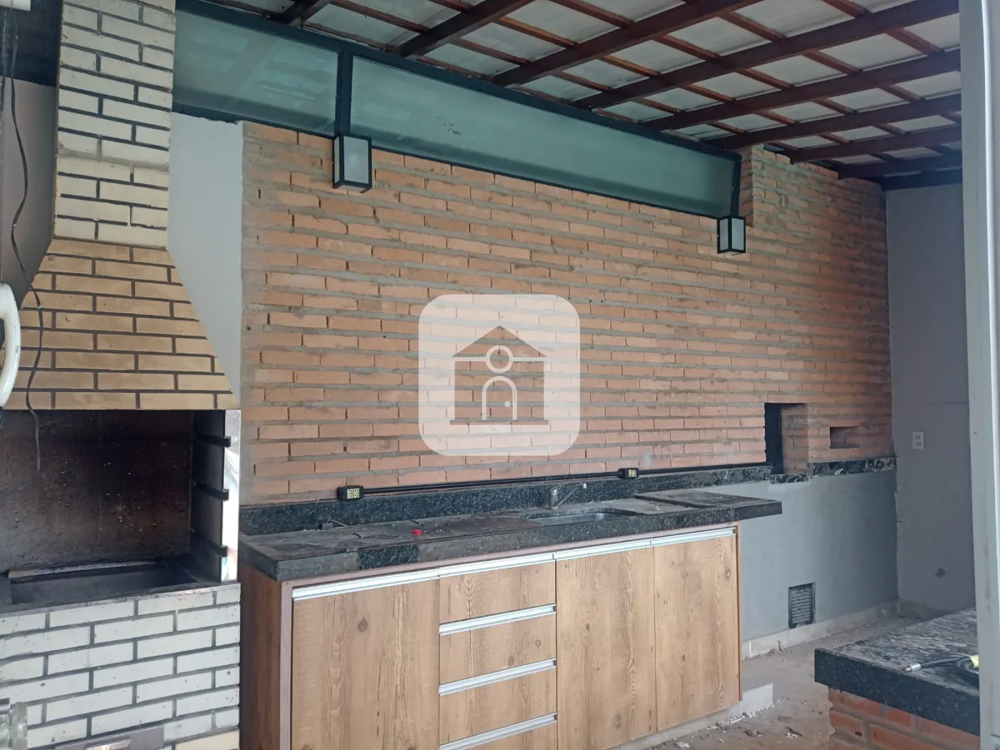 Cozinha gourmet com churrasqueira e armários;