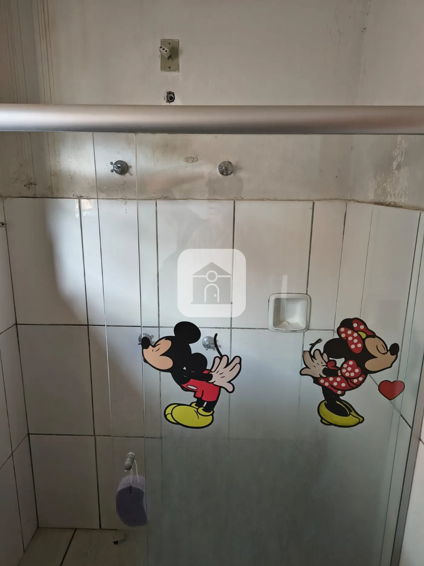 Banheiro social com armário e box em blindex;
