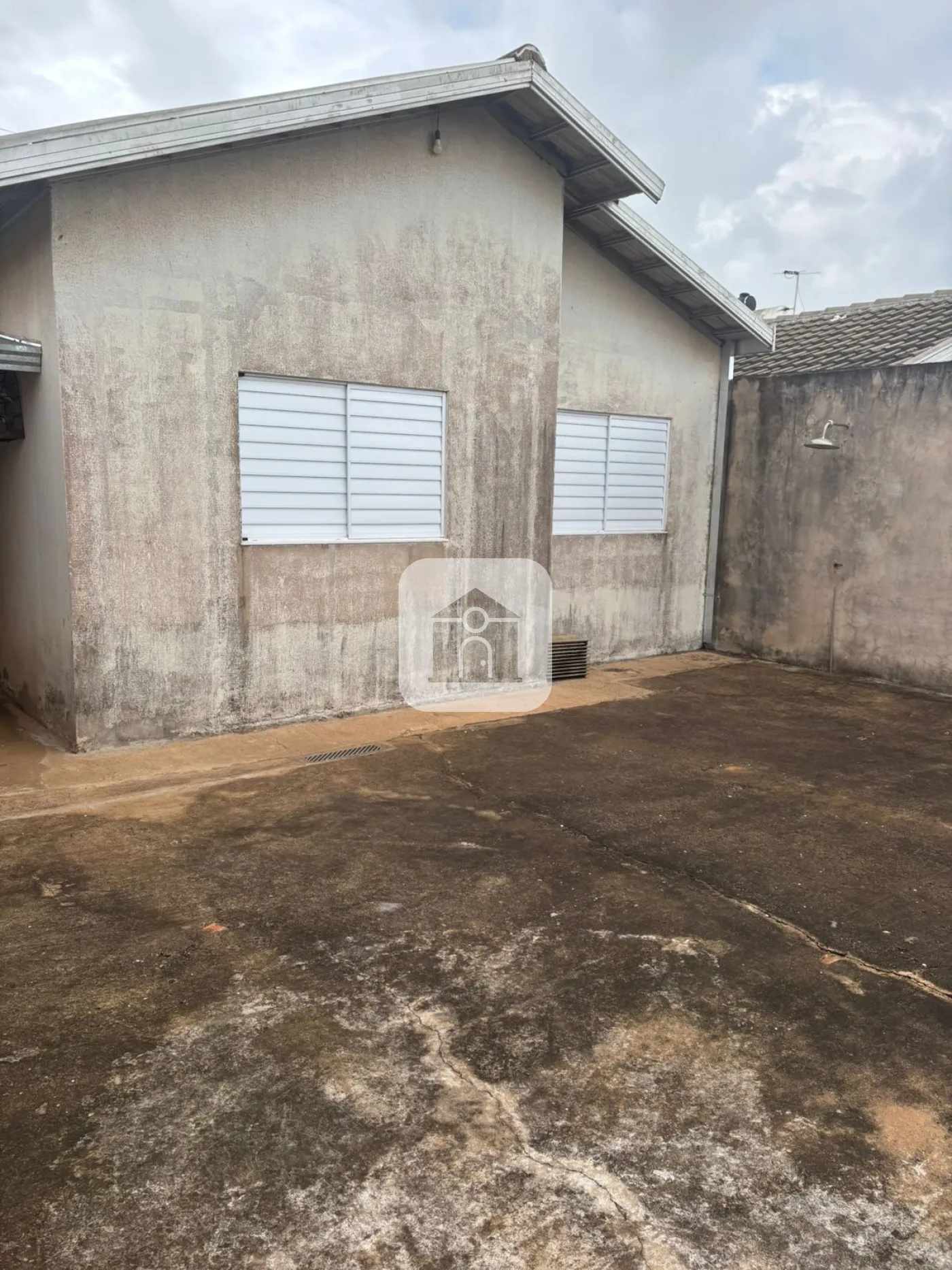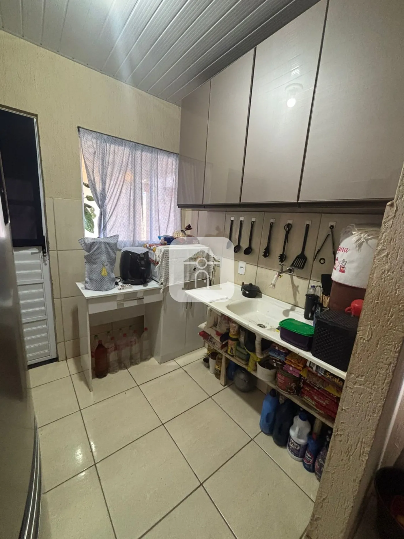 Com armário da cozinha, tem ducha, grama no quintal.