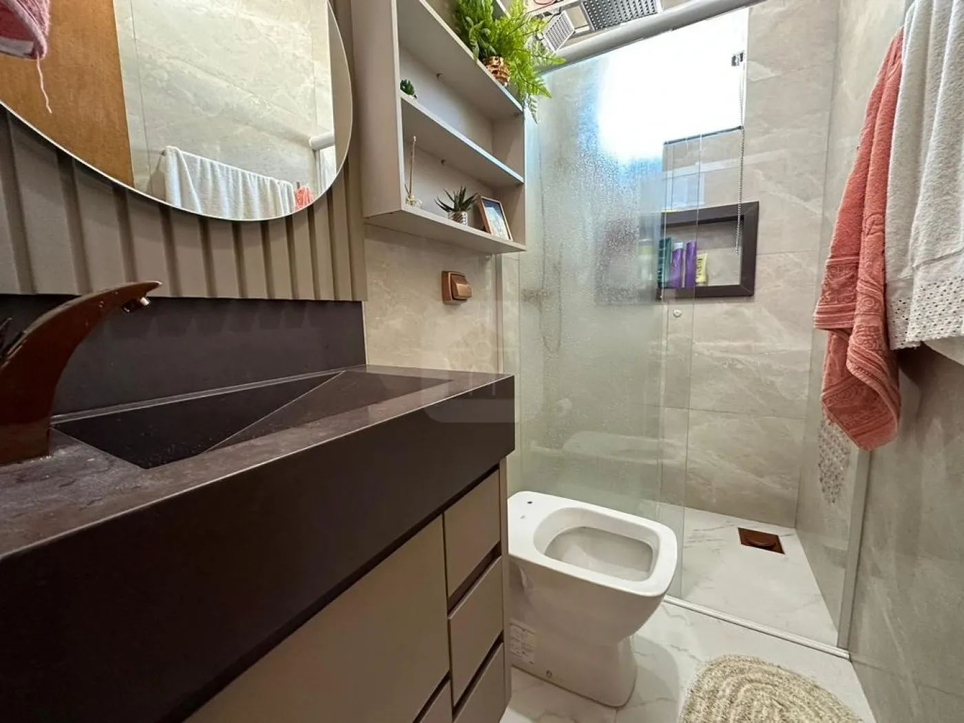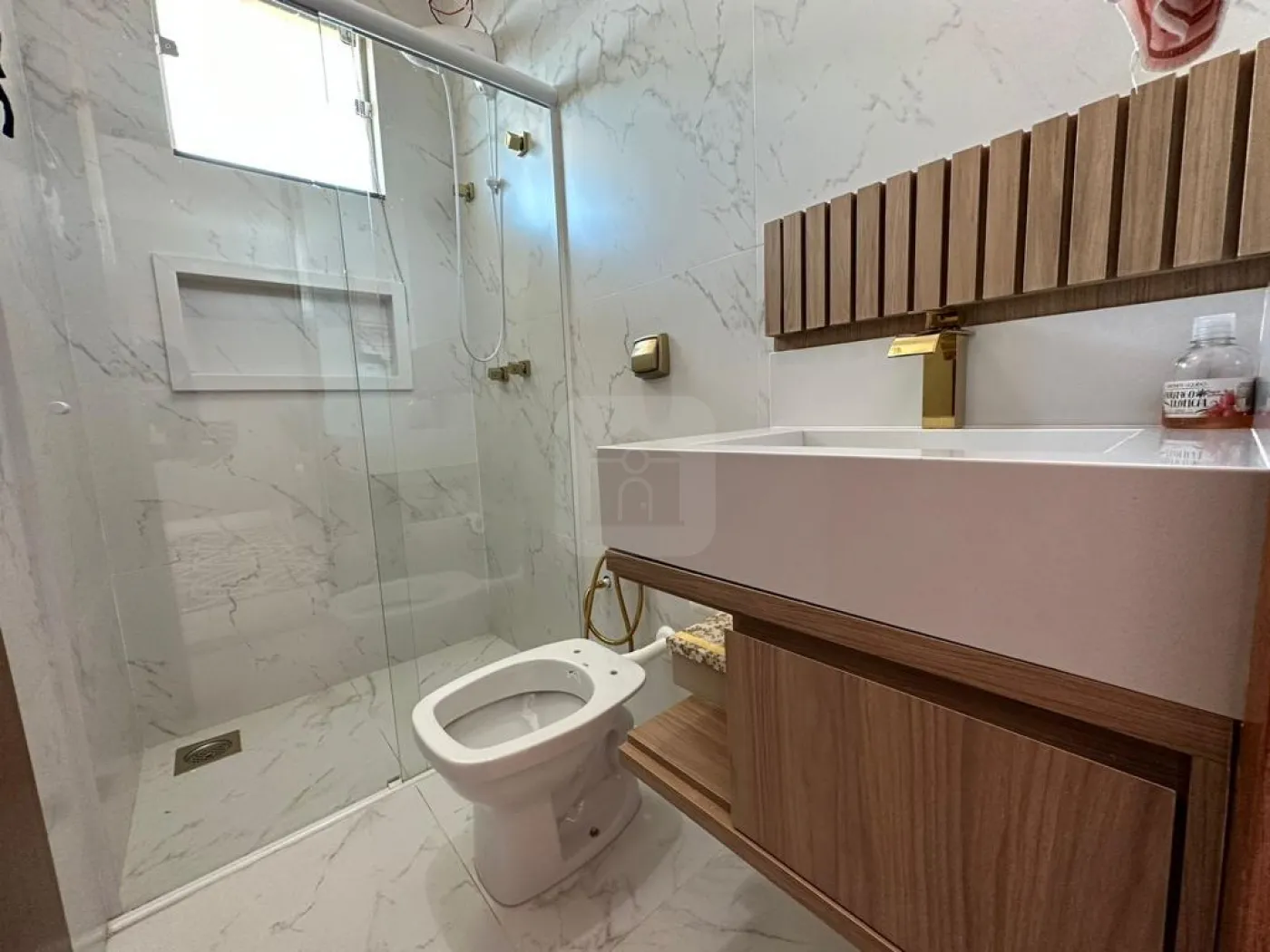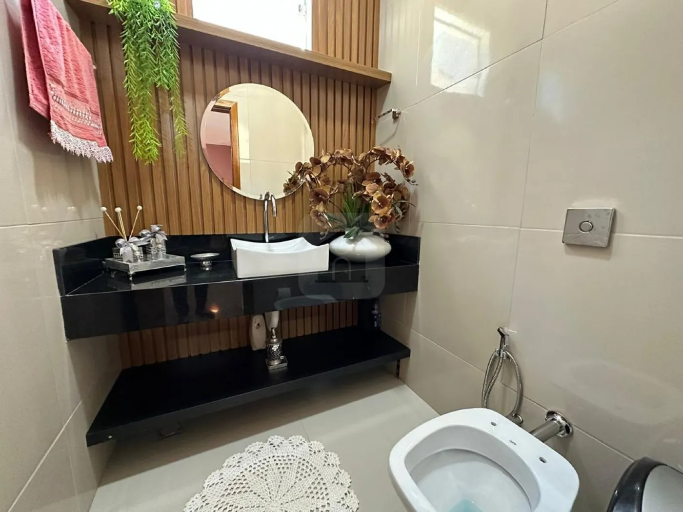 - Um lavabo com armário planejado,
