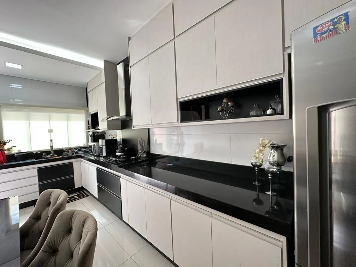 - Cozinha com armários planejados e coifa,