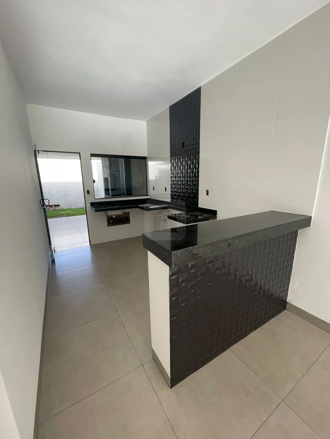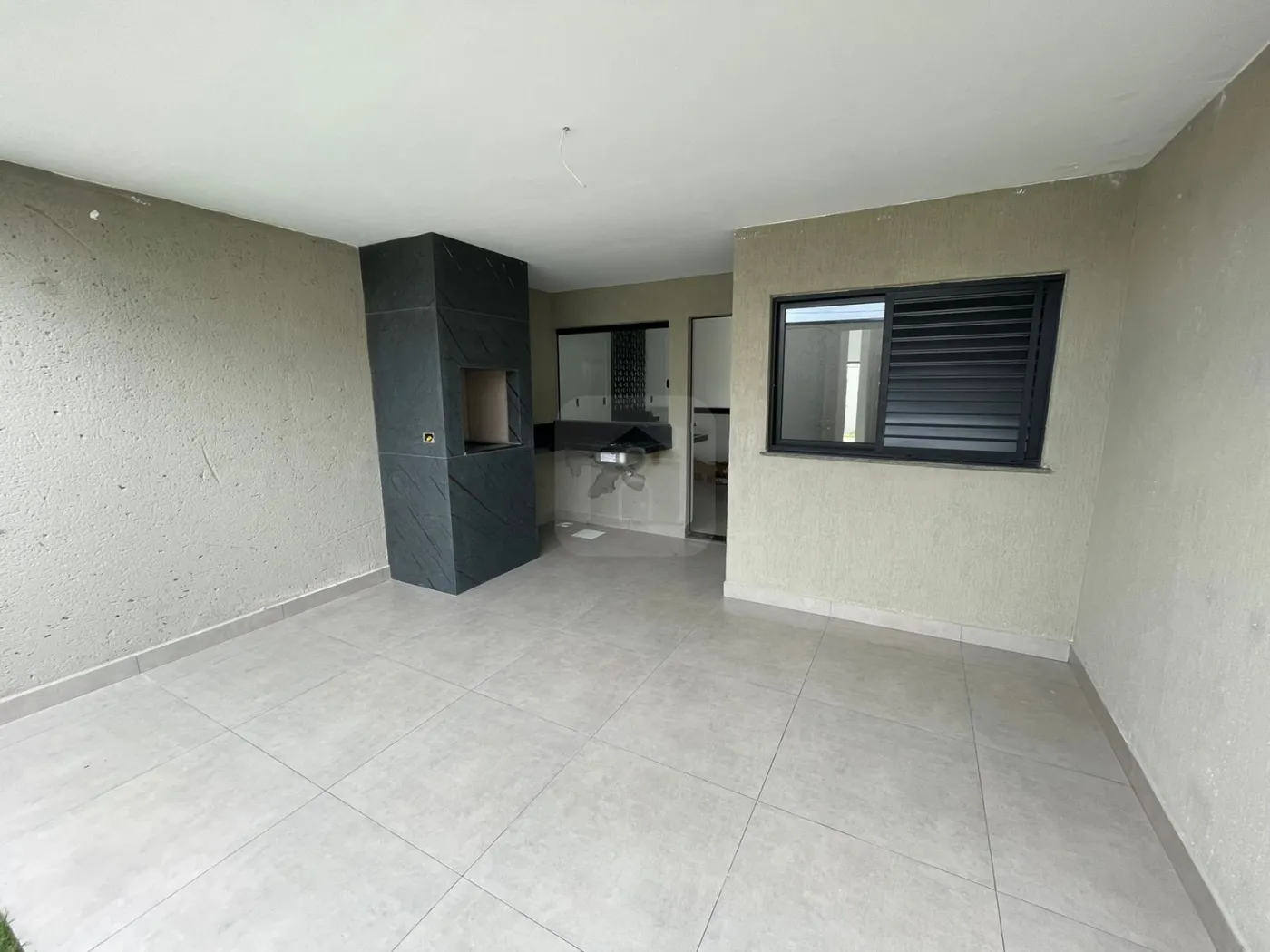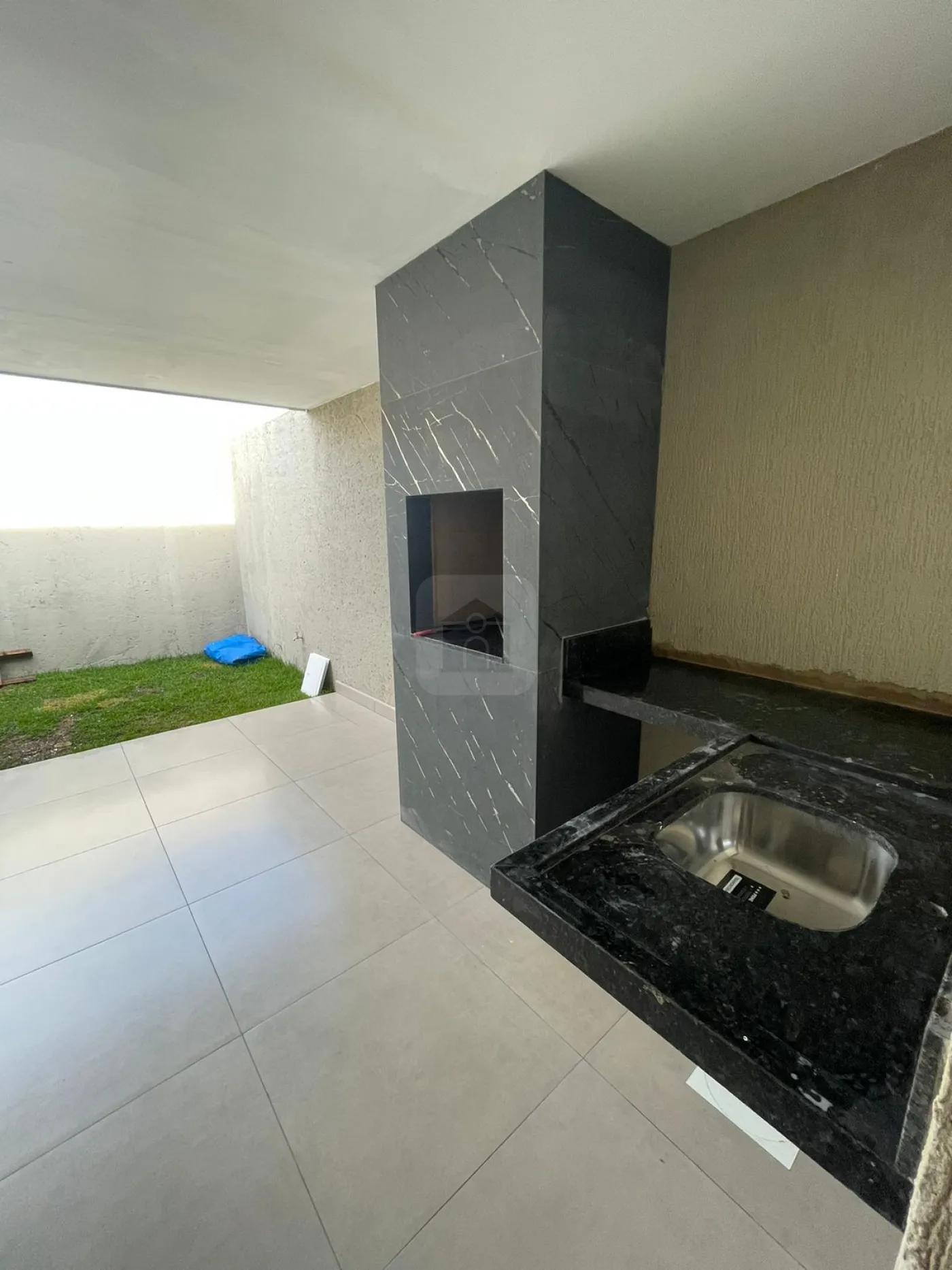 - Varanda gourmet com bancada pia e churrasqueira revestida de porcelanato,