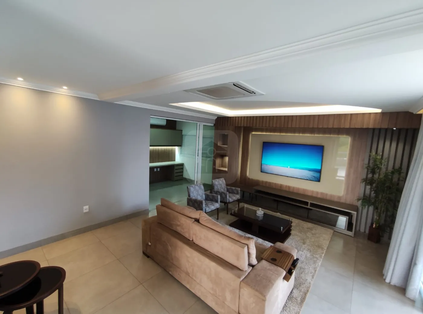 Ampla Sala De Tv Com Painel Ripado Em Madeira Em Toda Parede