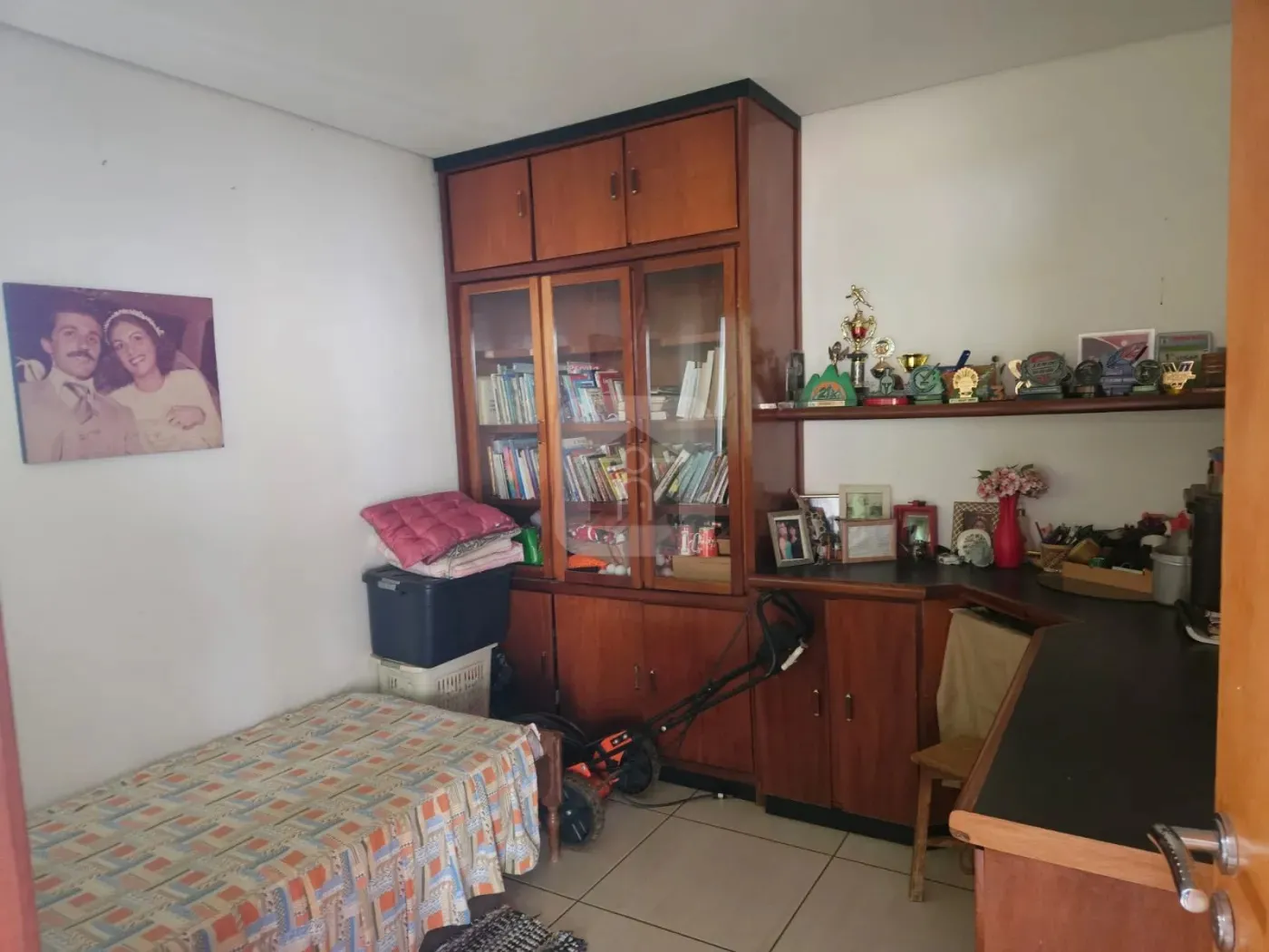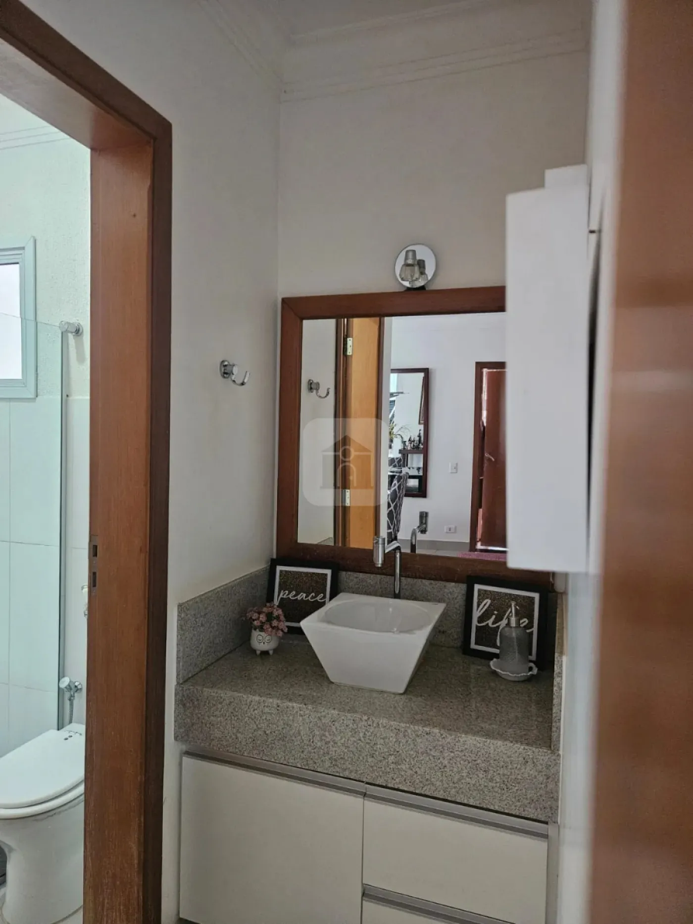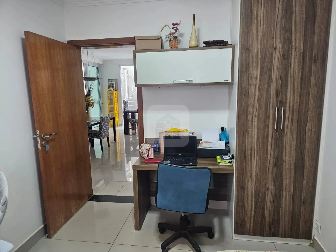 Ligado à sala, temos um escritório e o lavabo, posicionados de forma que podem ser isolados e transformados em mais uma suíte. O lavabo possui uma claraboia, permitindo iluminação natural durante todo o dia, e valorizando o revestimento especial da parede.