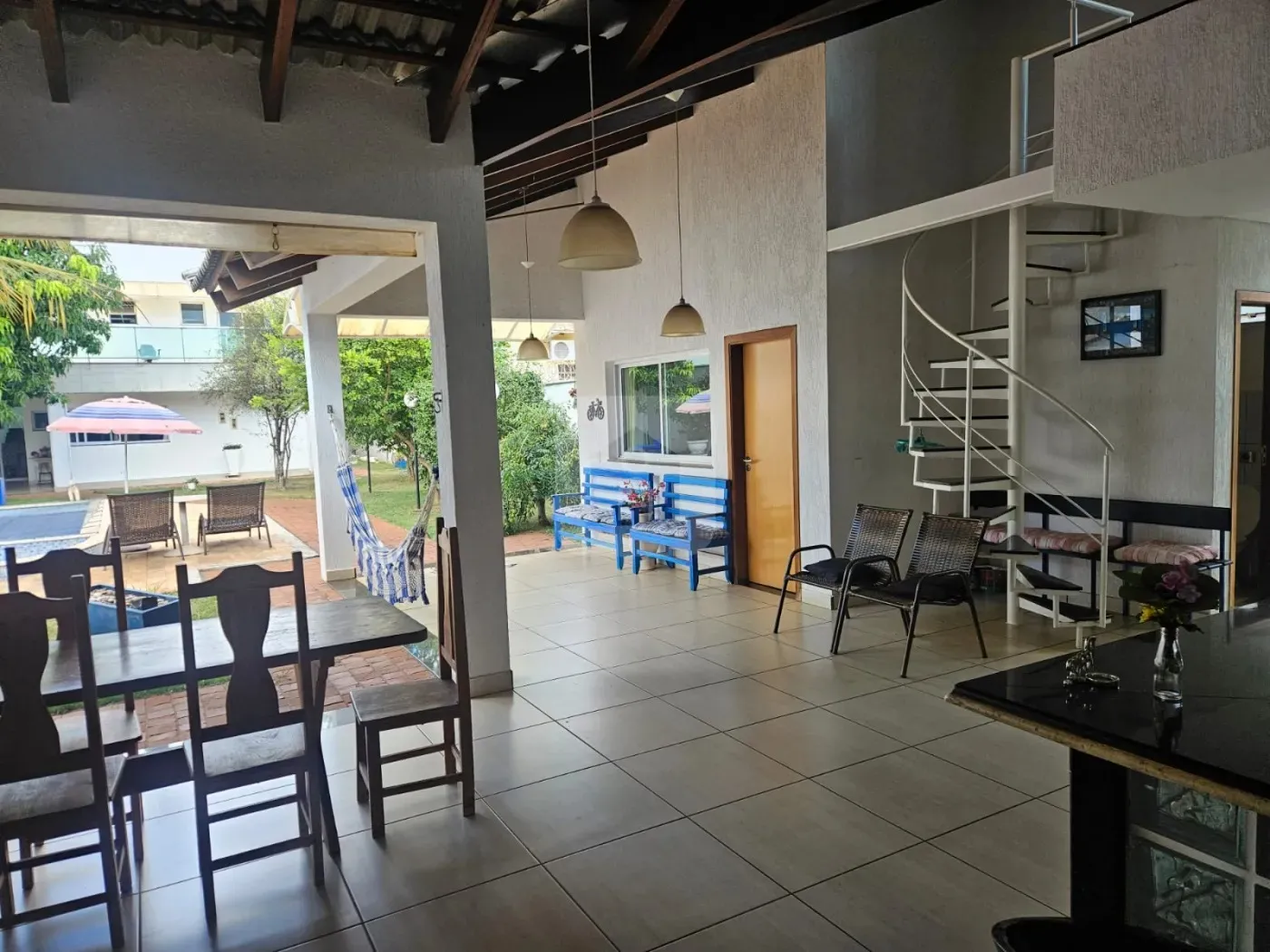 Toda a área social é interligada ao lazer, com piscina e cascata, que foi projetada para se ter uma boa área livre além do jardim, com espaço para colocação de móveis, e assim, possibilitando o aproveitamento de toda a área livre.