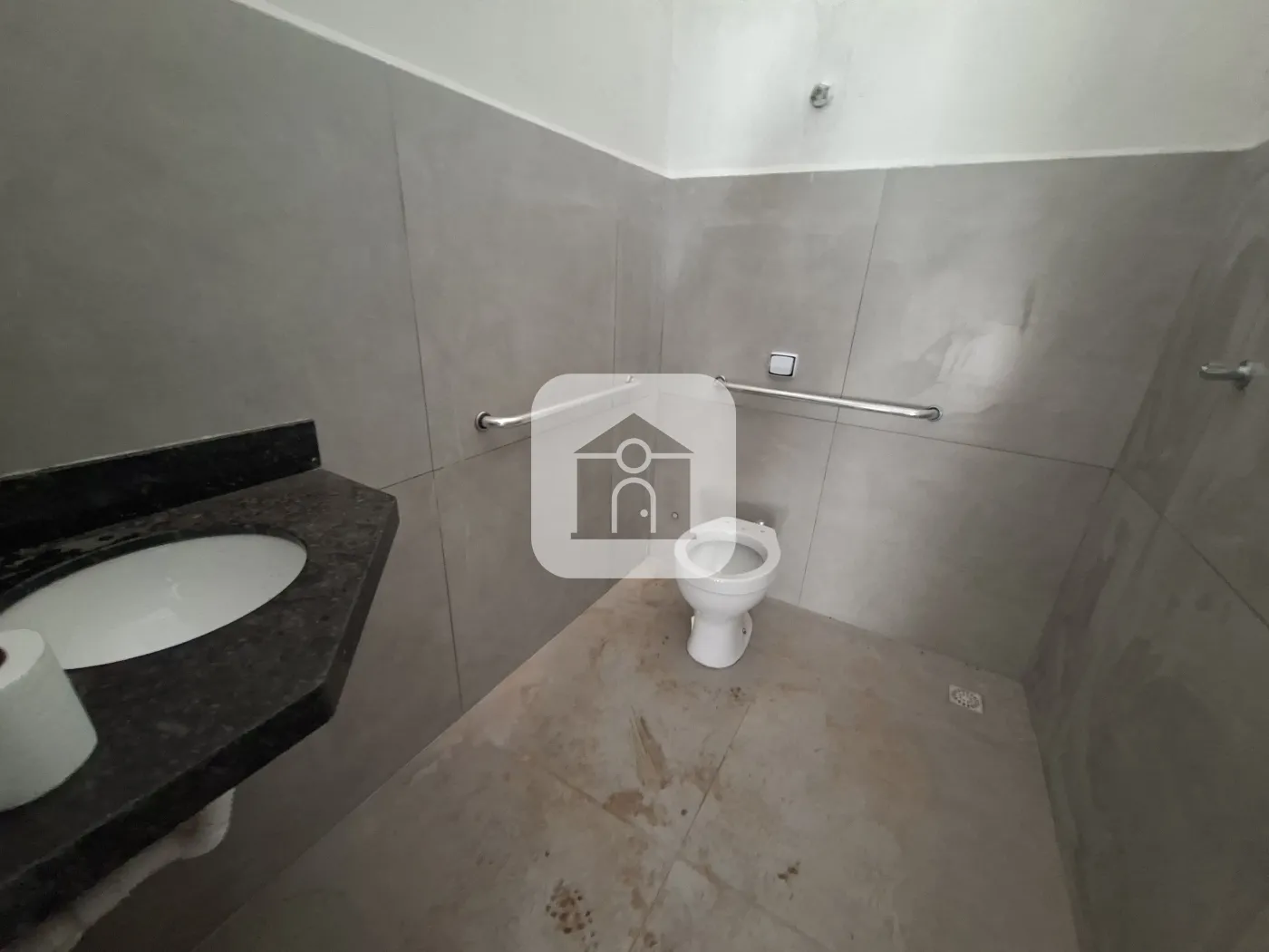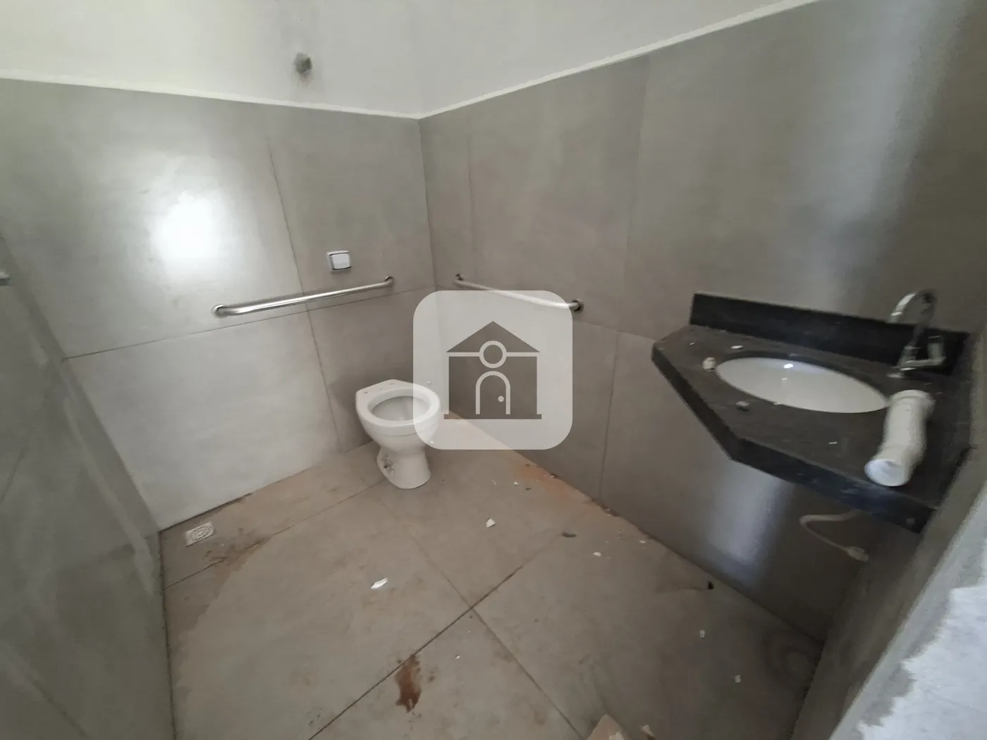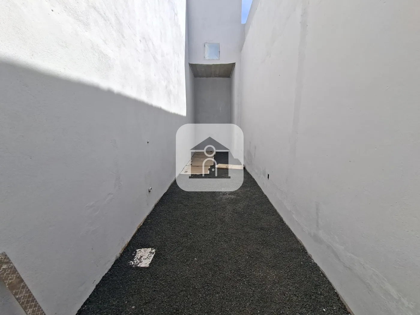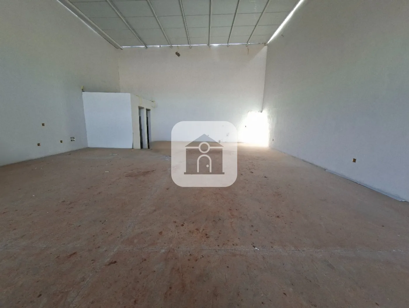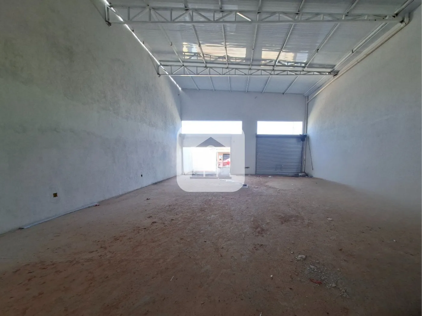 Barracão com 238,08?m² de área total ? sendo 184,38?m² de construção no térreo e 53,70?m² de mezanino ? mais 58,17?m² de área permeável. O piso é em concreto polido, com telhas tipo sanduíche e acabamento interno branco. As paredes são pintadas de branco e a escada possui estrutura metálica preta, assim como o piso e o guarda?corpo do mezanino. Dispõe de dois banheiros com acessibilidade e uma cozinha básica.