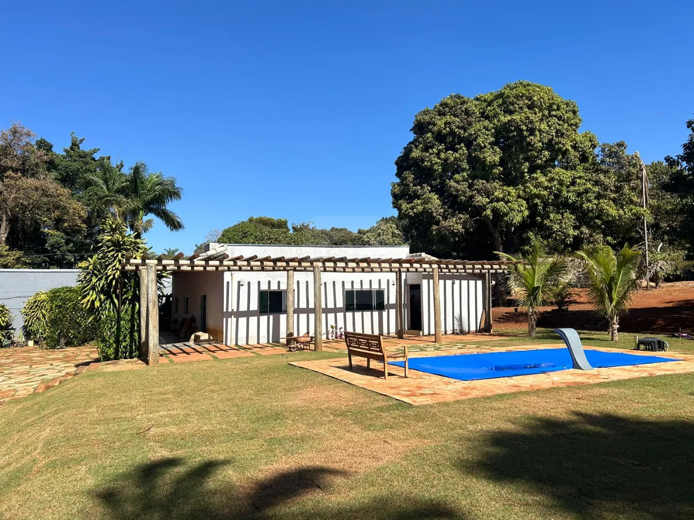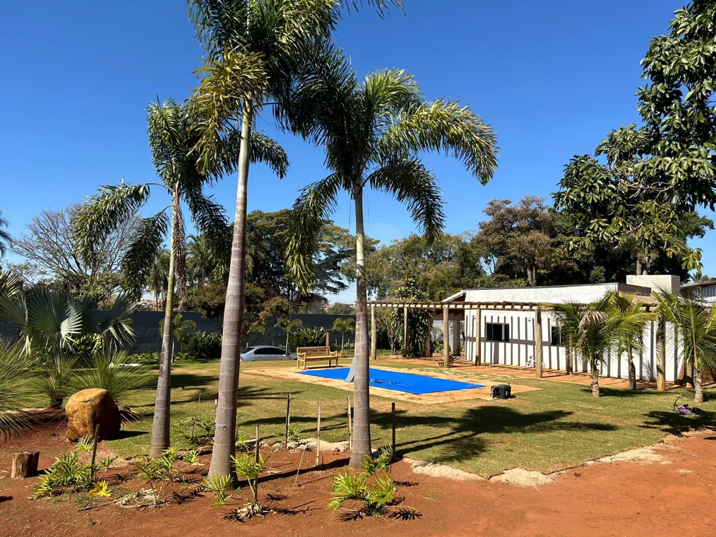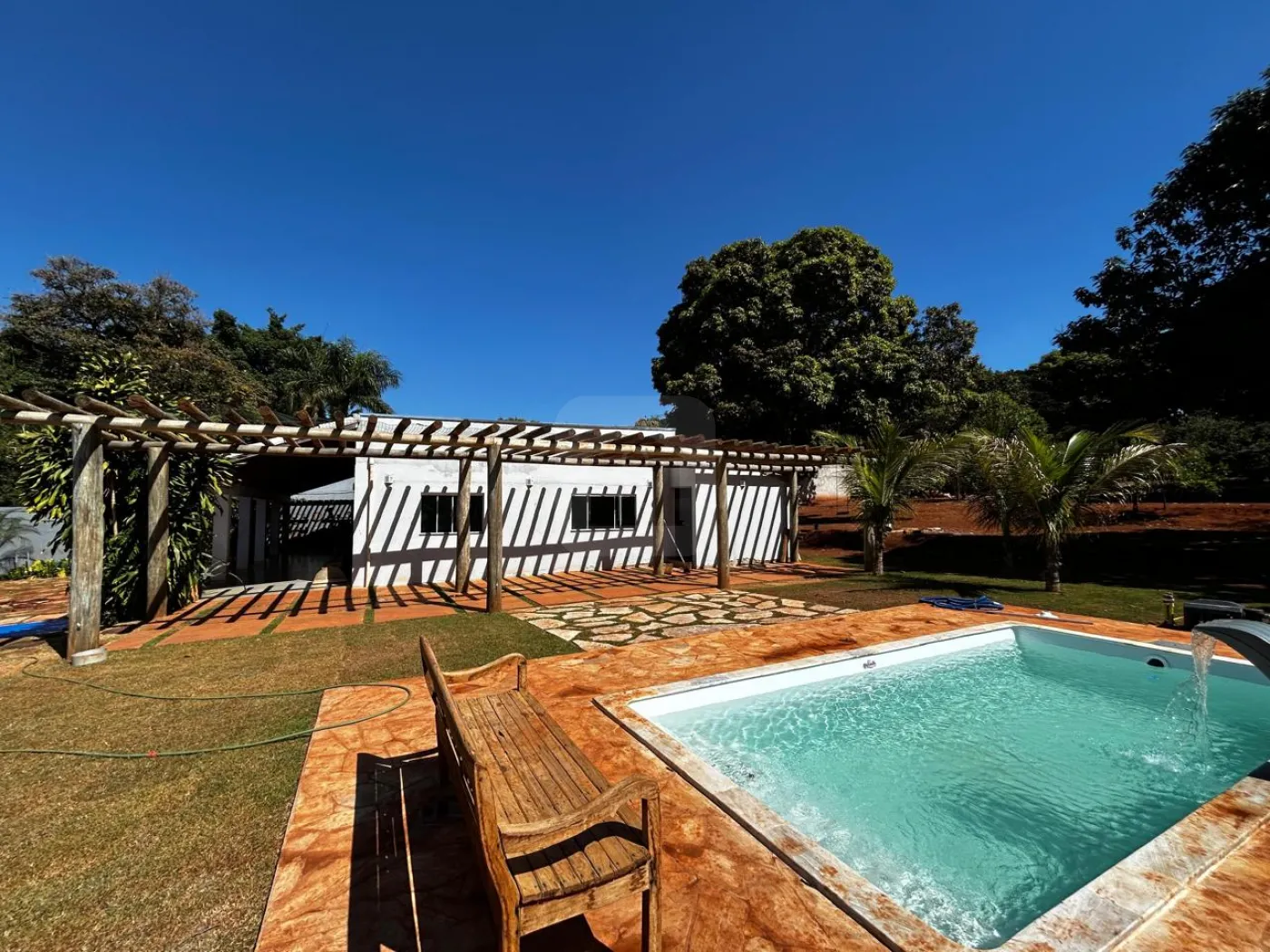 03 Quartos sendo 01 suíte, banheiro suíte com box vidro, sala, escritório, sala de jantar, cozinha com armário cooktop/ suggar, 01 banheiro social com box vidro, área de serviço, garagem 01 carro, estacionamento 06 carros, piscina, irrigação automática, árvores frutíferas, poço artesiano, chácara toda murada 221m de muro