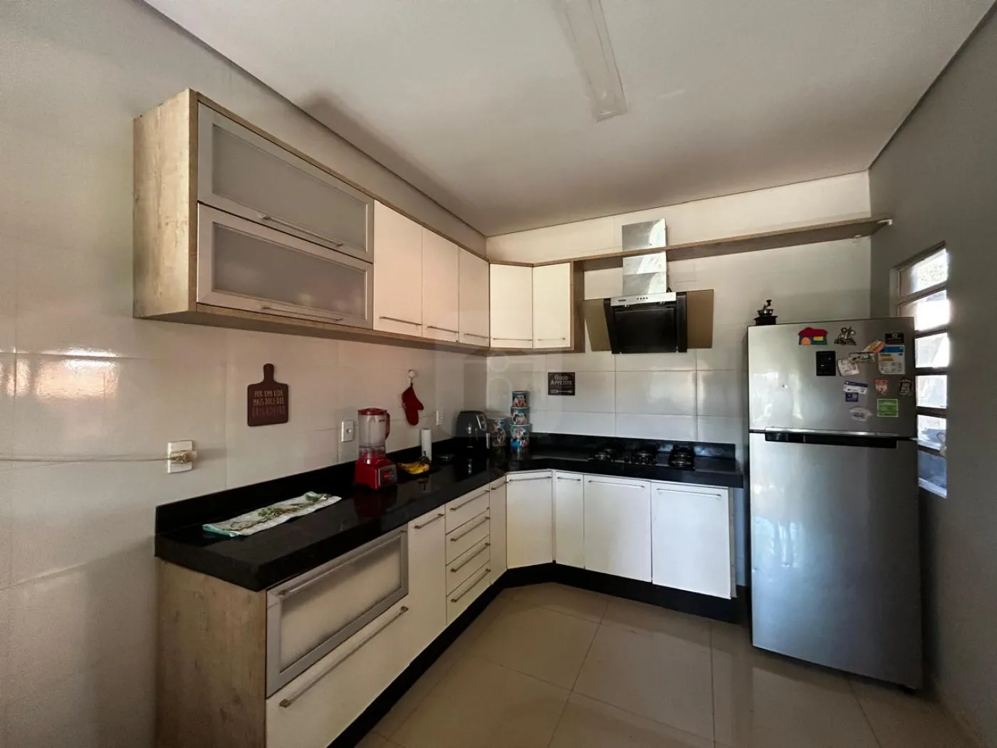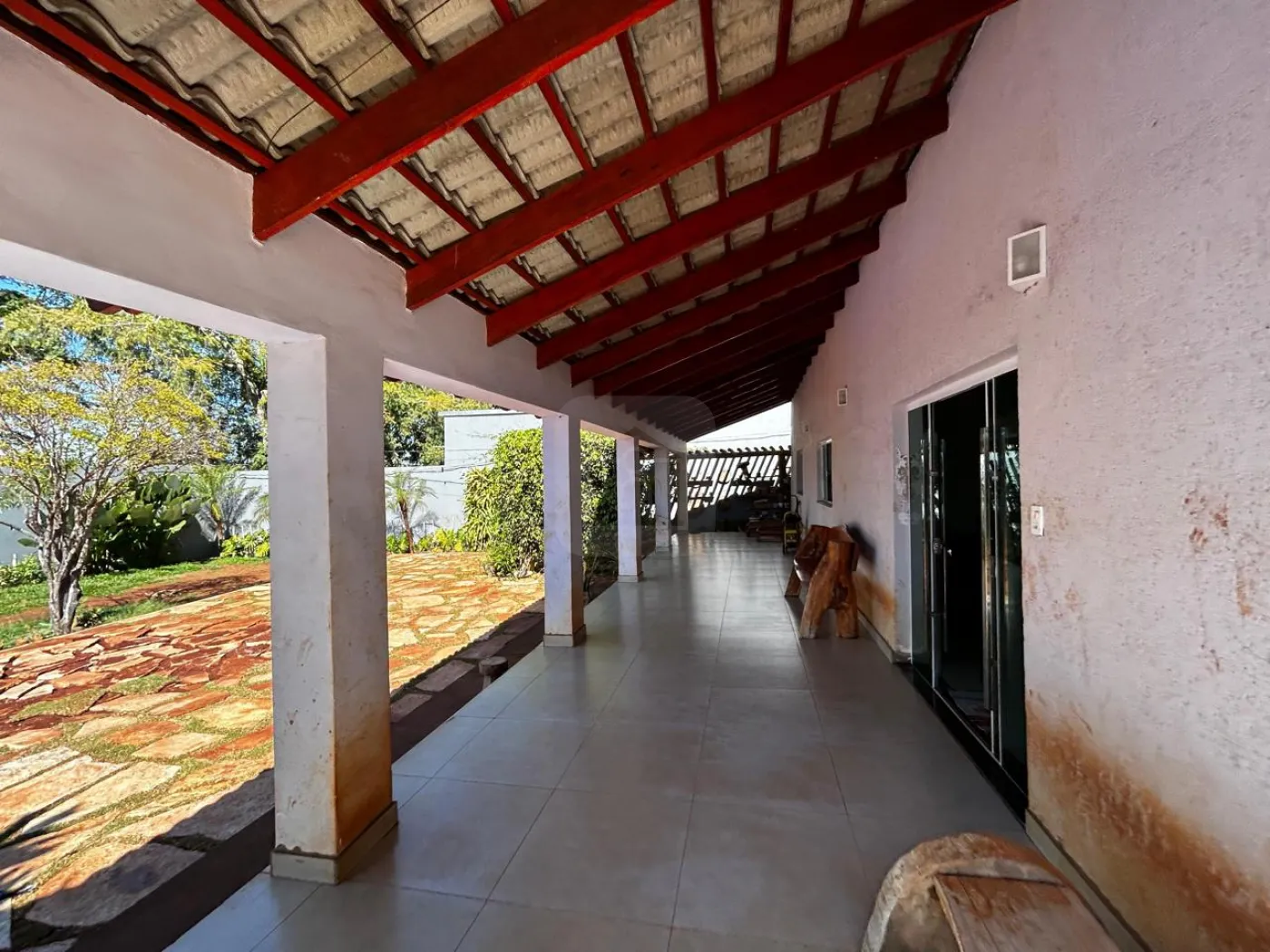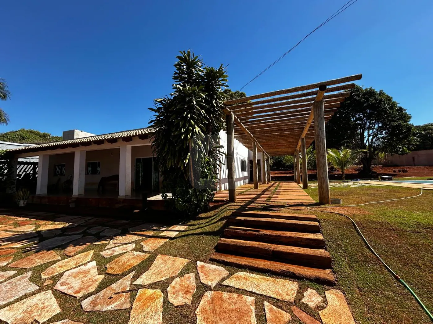 03 Quartos sendo 01 suíte, banheiro suíte com box vidro, sala, escritório, sala de jantar, cozinha com armário cooktop/ suggar, 01 banheiro social com box vidro, área de serviço, garagem 01 carro, estacionamento 06 carros, piscina, irrigação automática, árvores frutíferas, poço artesiano, chácara toda murada 221m de muro