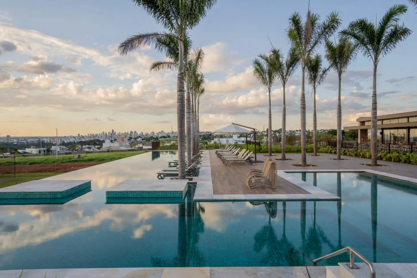 Lazer completo com piscinas adulto de 25m de raia e borda infinita e infantil climatizadas;