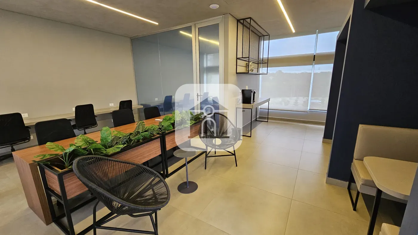 Espaço coworking com diversas posições de trabalho e sala de reuniões reservada,