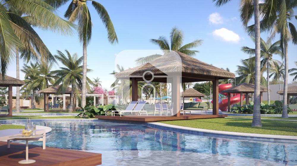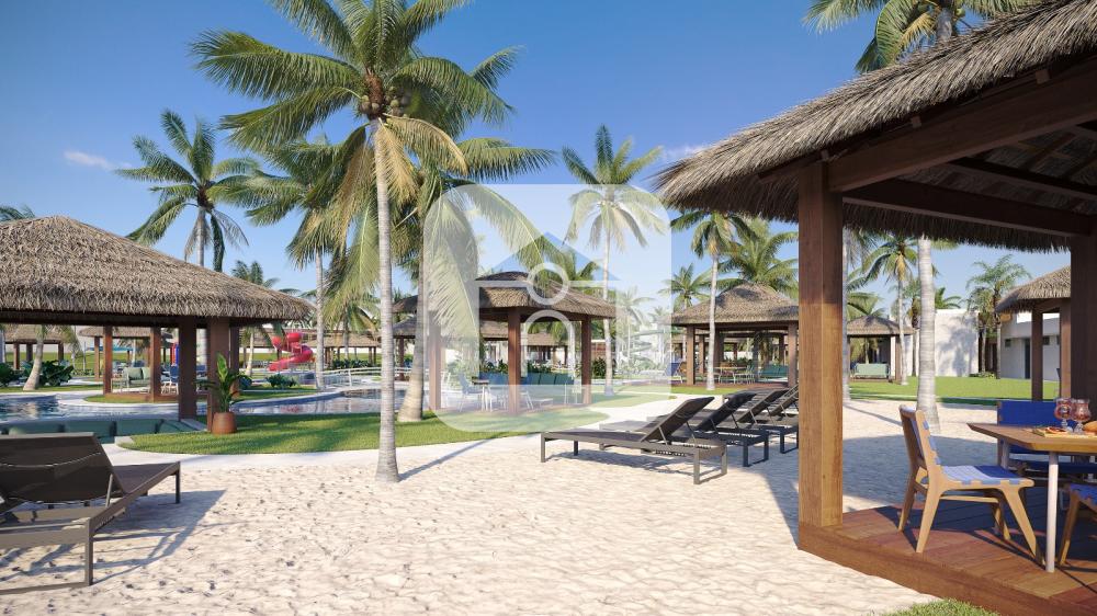 Parque aquático completo com piscinas sinuosas, hidromassagens, bar molhado e seco, areia branca com coqueiros e bangalôs privativos.